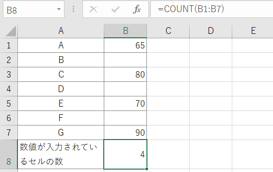 ②、次の通り、「セルB8」に「数値が入力されているセル数」が求められました。