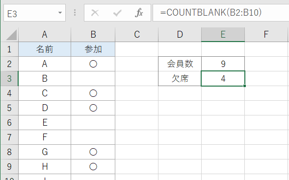 上記の関数では「B2からB10」までの範囲で「空白(欠席)」のセル数をもとめます。
