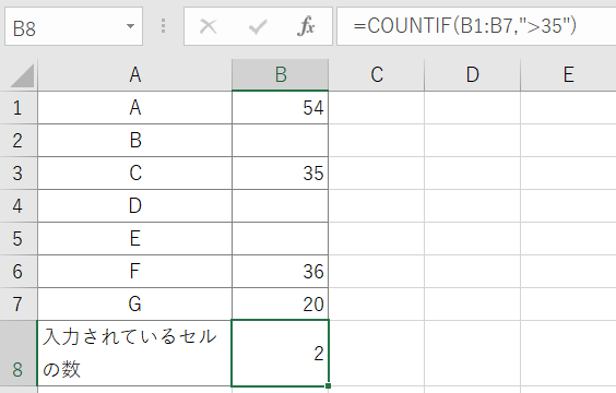 上記の関数では「B1からB7」までの範囲で「35」より大きい数のセル数をもとめます。